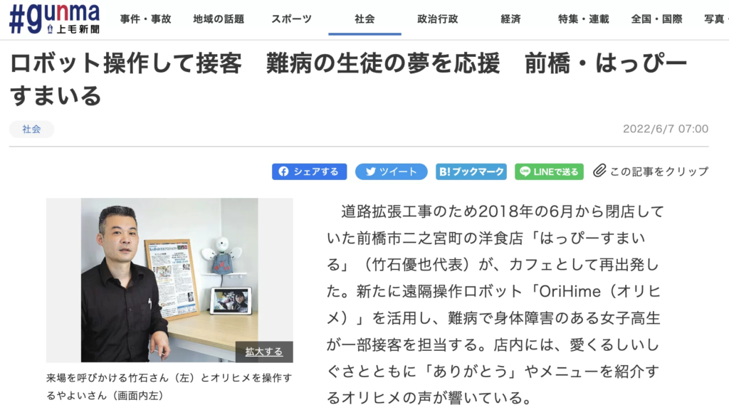 群馬県前橋市の飲食店「はっぴーすまいる」では、体を自由に動かす事ができない方々が遠隔操作する、接客や配膳を行う分身ロボット(オリヒメ)を使用しており、そのような方を雇用し、働く環境を提供しています。